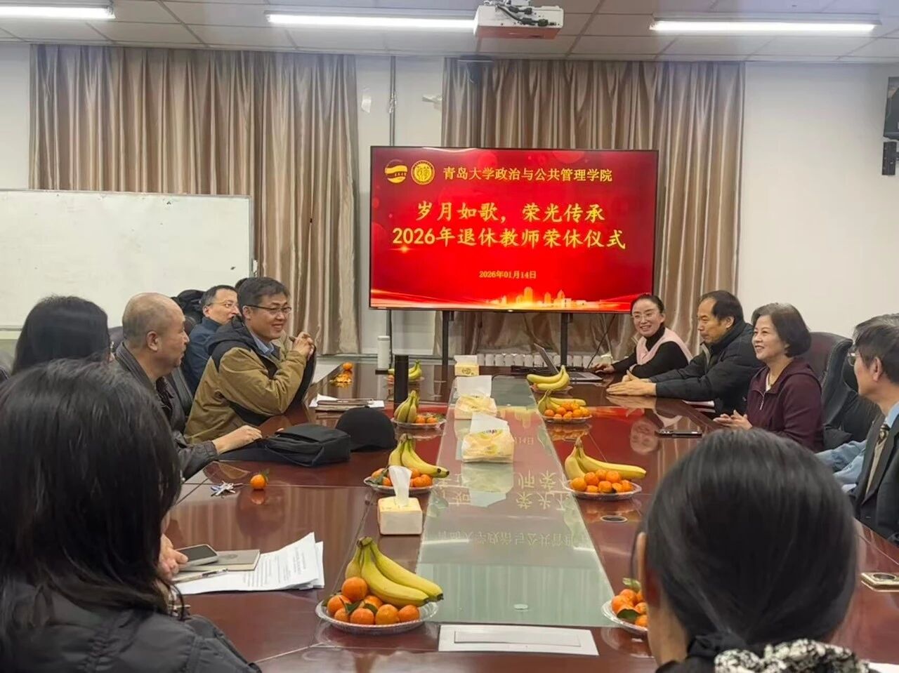为感念退休教师的辛勤付出,弘扬学院尊师重教的优良传统,1月14日下午三点,政治与公共管理学院在二号实验楼214会议室举行了退休教师荣休仪式。学院党委书记尹文博、院长陈洪连、副院长韩庆娜、副院长王猛,退休教师林忠平、吕尧太、余丽萍、景怀亮以及教师代表与学生代表参会。会议由学院党委副书记徐伟主持。