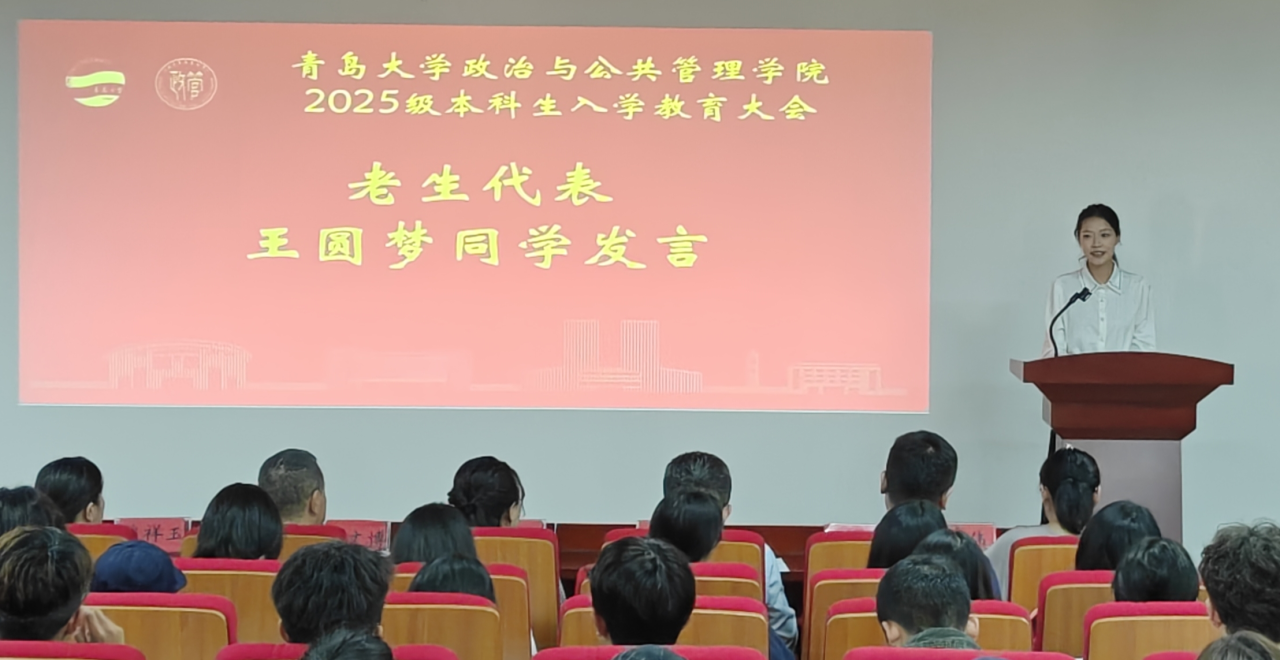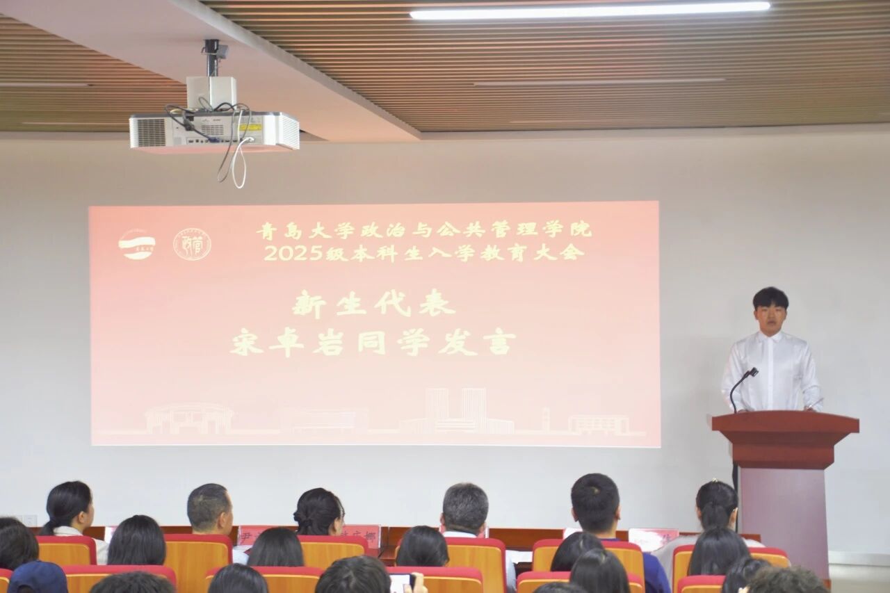 新生代表宋卓岩回顾了自己从入学以来的心得与感悟,他表示在政管这个大家庭中不仅收获了珍贵的友情,更是深刻感受到像“家”一般的归属感与幸福感。他代表2025级全体本科生做出承诺:一是明德修身,做到行稳致远;二是精进知识,努力锤炼真知;三、深入基层,勇于实干担当,努力成长为有理想、有本领、有担当的政管人。